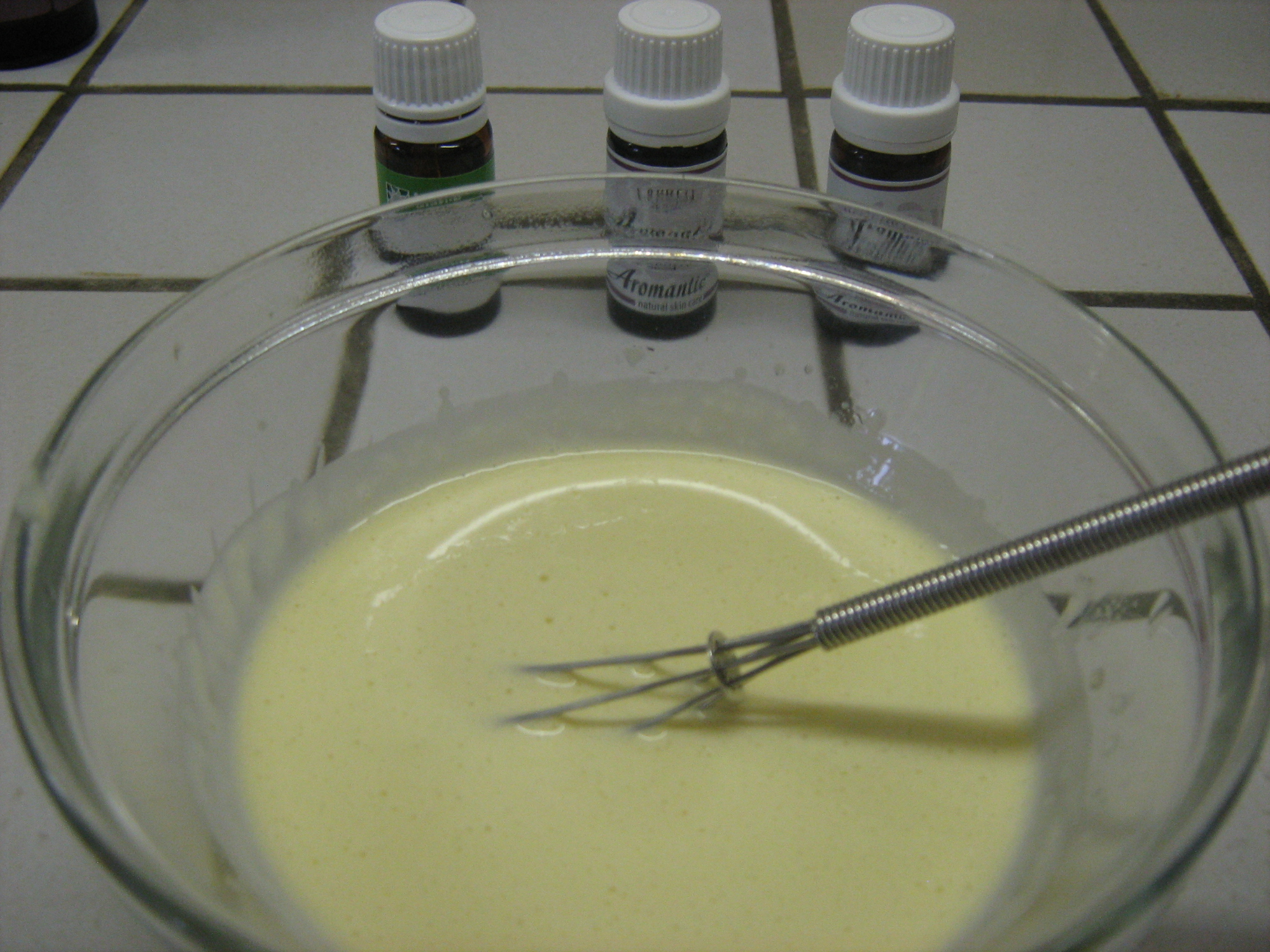 Petit aparté au sujet des mini-mixer. Lorsque vous faites une émulsion, attention de garder la tête de votre mini-mixer bien au fond de votre récipient. Si vous l’approchez de la surface, celui-ci va incorporer de l’air à votre préparation. Vous risquez de vous retrouver avec une mousse ! Et si la texture « mousse » n’est pas désagréable, elle a un inconvénient: votre préparation contient de l’air, et s’oxydera donc beaucoup plus vite. Essayez donc d’ôter le plus possible les bulles d’air avant la mise en flacon.
