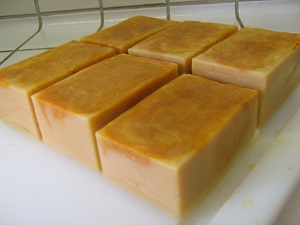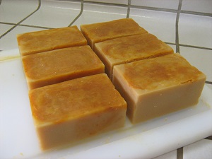 Mes savons coulés, j’hésite à les couvrir de papier étirable comme on le fait généralement.. Ils contiennent beaucoup de liquides, qui vont devoir s’évaporer.. De plus l’ajout de lait augmente la température pendant la saponification. La chaleur doit donc pouvoir s’échapper. Je les laisse tels quels et couvre simplement mon moule d’une serviette, quitte à avoir un petit dépôt blanc sur la face visible de mes savons (« cendre de soude », au contact de l’air).