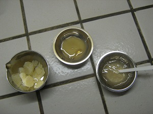 cire + miel vit.E + eau aloe glycerine acide hyaluro. Puis je prépare mes actifs: le miel, la Vitamine E et les « gels ».