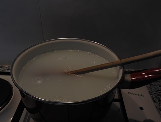 FONTE PAILLETTES Je fais chauffer mon eau et y verse mes paillettes en pluie (dans la totalité de l’eau, plutôt qu’une partie comme l’indique la recette sur l’étiquette). Je remue jusqu’à complète dissolution. J’arrête mon feu et laisse refroidir. C’est tout pour le moment..