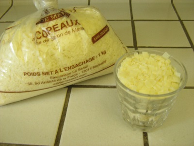 paillettes savon marseille  Je pèse mes paillettes de savon (ici 60 gr, pour 2 L d’eau)