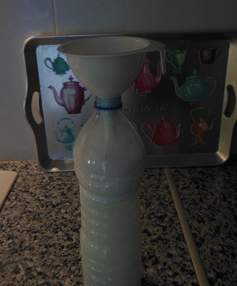 verser entonoire  A l’aide d’un entonnoir je verse 1 L dans 1 bouteille de 1,5 L (pour l’espace nécessaire vu plus haut).