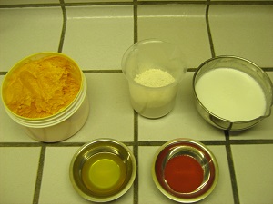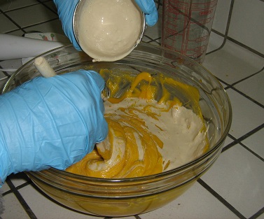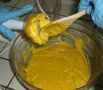 Comme je l’expliquais dans la 1ère partie, j’ai voulu saponifier mon baume pour le corps, beaucoup trop dosé en Carotène. La recette calculée, j’avais prévu de mettre une moitié de mon baume dans mes HV de départ et l’autre moitié à la trace. En principe..