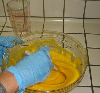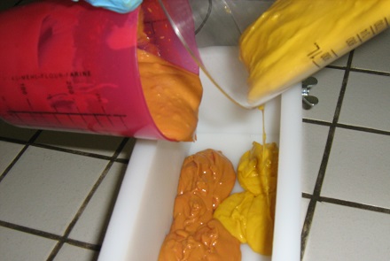 J’ai alors versé la moitié de mon batch dans un pichet. Puis ajouté l’oxyde rouge à la seconde moitié, elle aussi mise dans un autre pichet. Pourquoi ? Je voulais faire un marbrage.. Sans moule avec une séparation centrale, je voulais couler les 2 pâtes côte à côte simultanément.. Comme ceci:
