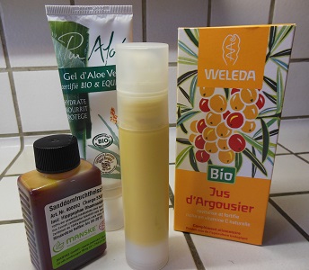 J’ai mixé de l’huile de graines (de chez Aromantic) et de l’huile de fruit (de chez Gisella Manske) afin d’obtenir une huile complète. J’ai aussi utilisé du jus d’Argousier, riche en vitamine C (je l’utilise en interne depuis quelques jours, autant coupler avec une utilisation externe).